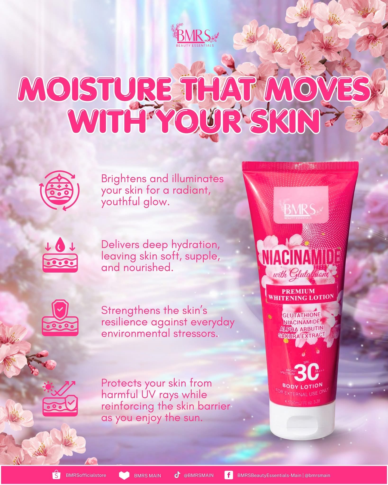 Reveal smoother, brighter-looking skin with BMRS Niacinamide with Glutathione Premium Whitening Body Lotion. This lightweight yet deeply nourishing body lotion is formulated with a blend of Niacinamide, Glutathione, Alpha Arbutin, and Sakura Extract to help improve the appearance of uneven skin tone, dryness, and dullness.