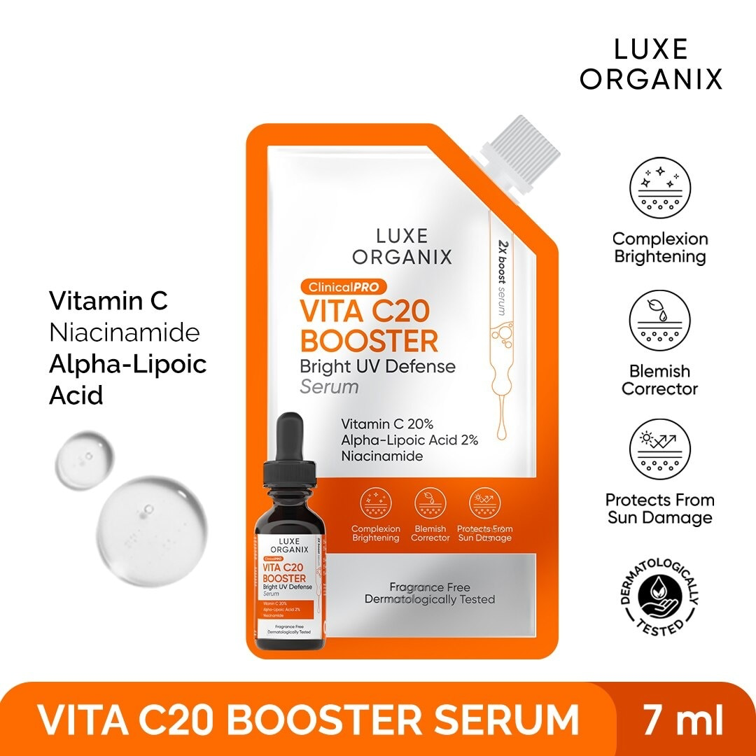 Luxe Organix Clinical PRO Vita C20 Booster Bright UV Defense Serum is formulated with 20% stable Vitamin C, a potent antioxidant that effectively brightens dull skin while preventing sun damage caused by free radicals. It helps boosts UV protection, visibly fades dark spots, while promoting a more even skin tone. With additional benefits from Alpha-Lipoic Acid and Niacinamide to help combat rough and textured skin.