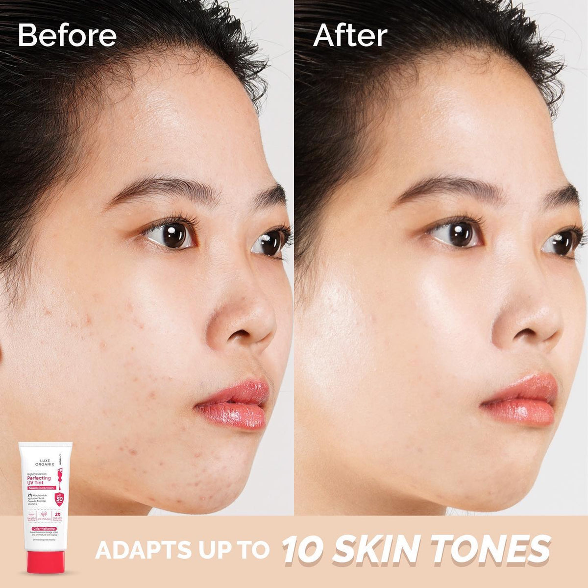 Luxe Organix High Protection Perfecting UV Tint Serum Sunscreen SPF 50 PA +++ 40g is a lightweight and non-sticky tinted hybrid sunscreen with SPF50 PA+++ UVA/UVB broad spectrum protection. With its advanced colour-adjusting formulation, this tinted sunscreen evens out the skin tone and instantly brightens the complexion, while protecting the skin against external pollution.