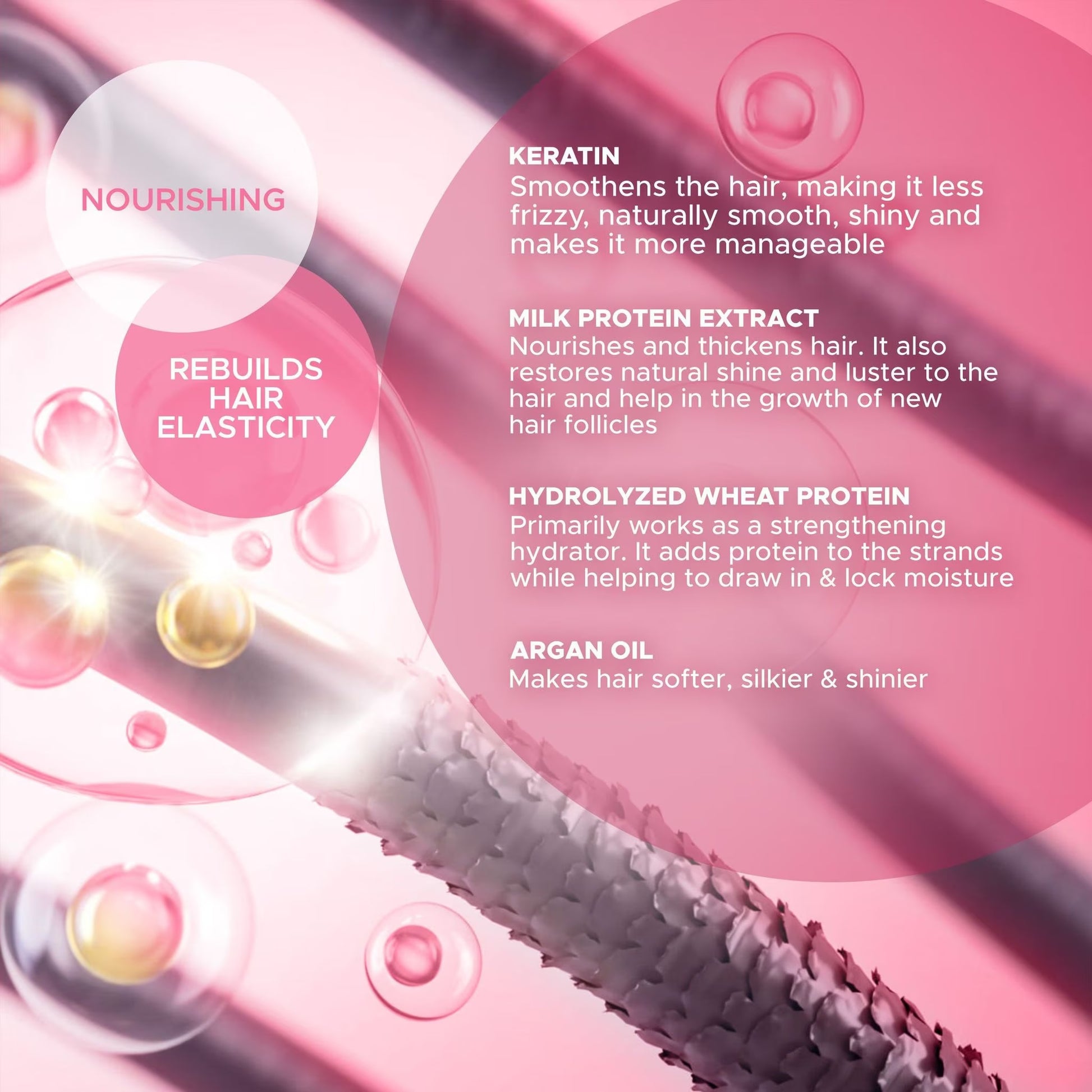 The combination of Keratin and Milk Protein helps moisturize, nourish and improve hair manageability by restoing hair's natural protective layer, rebuilding its strength and elasticity. With continuous use, it will reduce damage caused by chemicals, leaving your hair more silky and manageable.