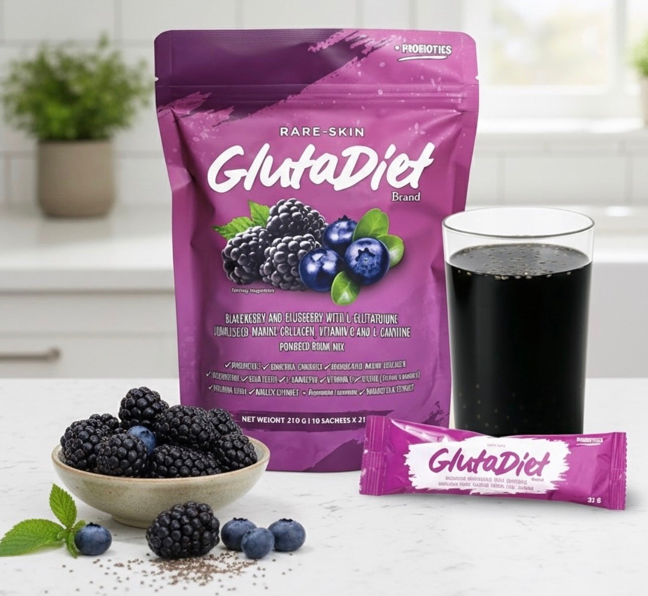 GlutaDiet Detox Glow Wellness Drink is a daily wellness blend formulated with glutathione, marine collagen, probiotics, and antioxidant-rich extracts. It is designed to support digestion, reduce bloating, promote regular bowel movements, and help maintain a radiant-looking complexion from within.
