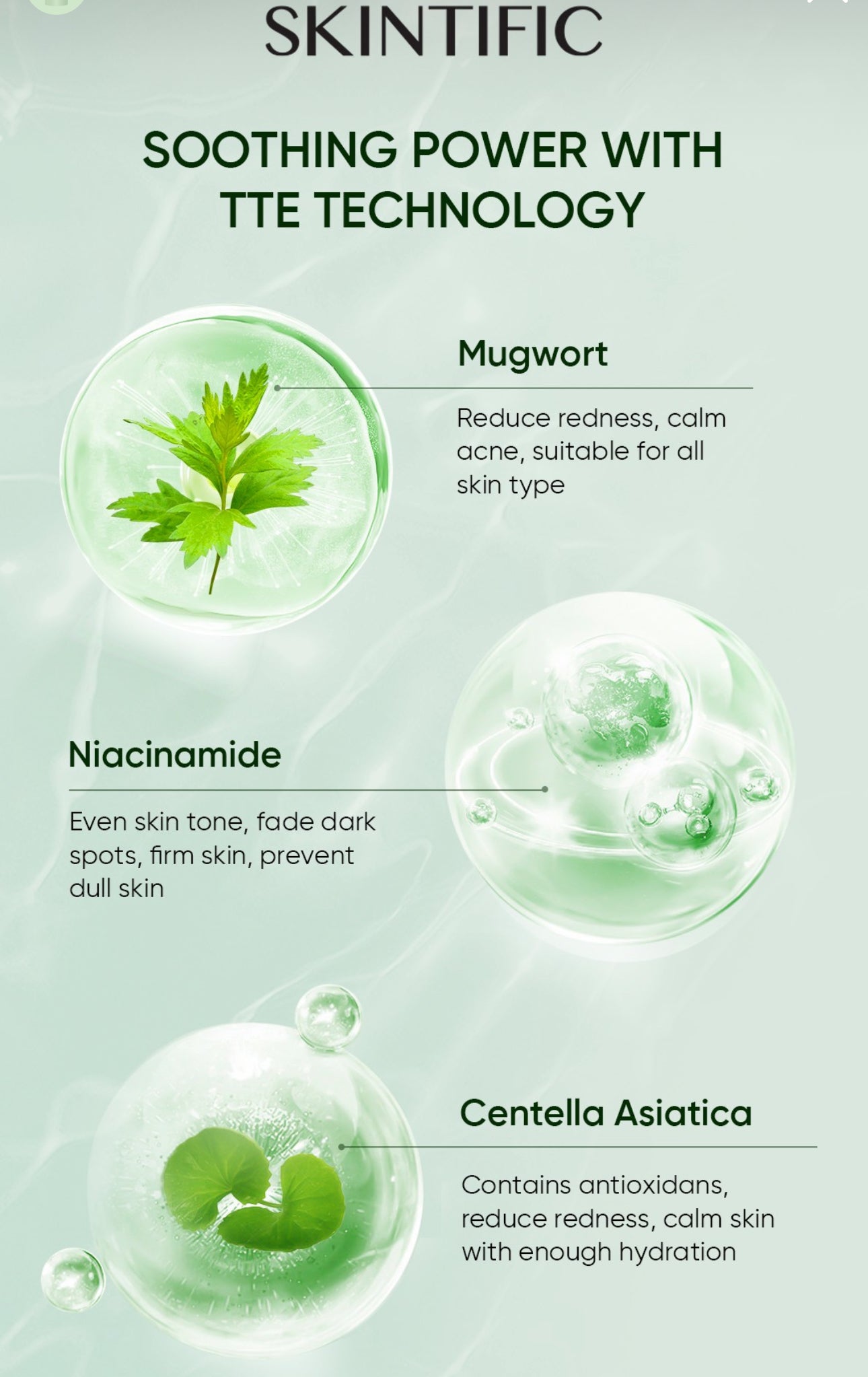 Mugwort : Has good anti-inflammatory properties to cleanse & soothe the skin. The skin barrier of the skin will always be maintained and shrink pores