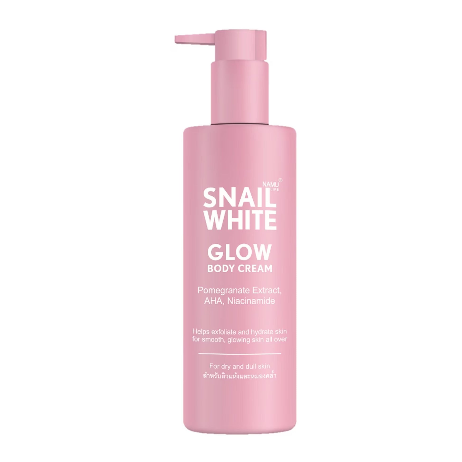 A luxurious body cream specifically formulated to help exfoliate skin for ultra hydrated and glowing skin all over. Enriched with Pomegranate Extract and Lactic Acid, this lightweight and non-stick creamy lotion gently exfoliates for a smooth, healthy and glowing complexion. Hyaluronic Acid and Snail Mucin help moisturize, hydrate and improve skin's elasticity. Vitamin C and Niacinamide help even out skin tone and visibly reduce dark spots. Recharge and give your skin the care it deserves with SNAILWHITE Glow Body Cream!